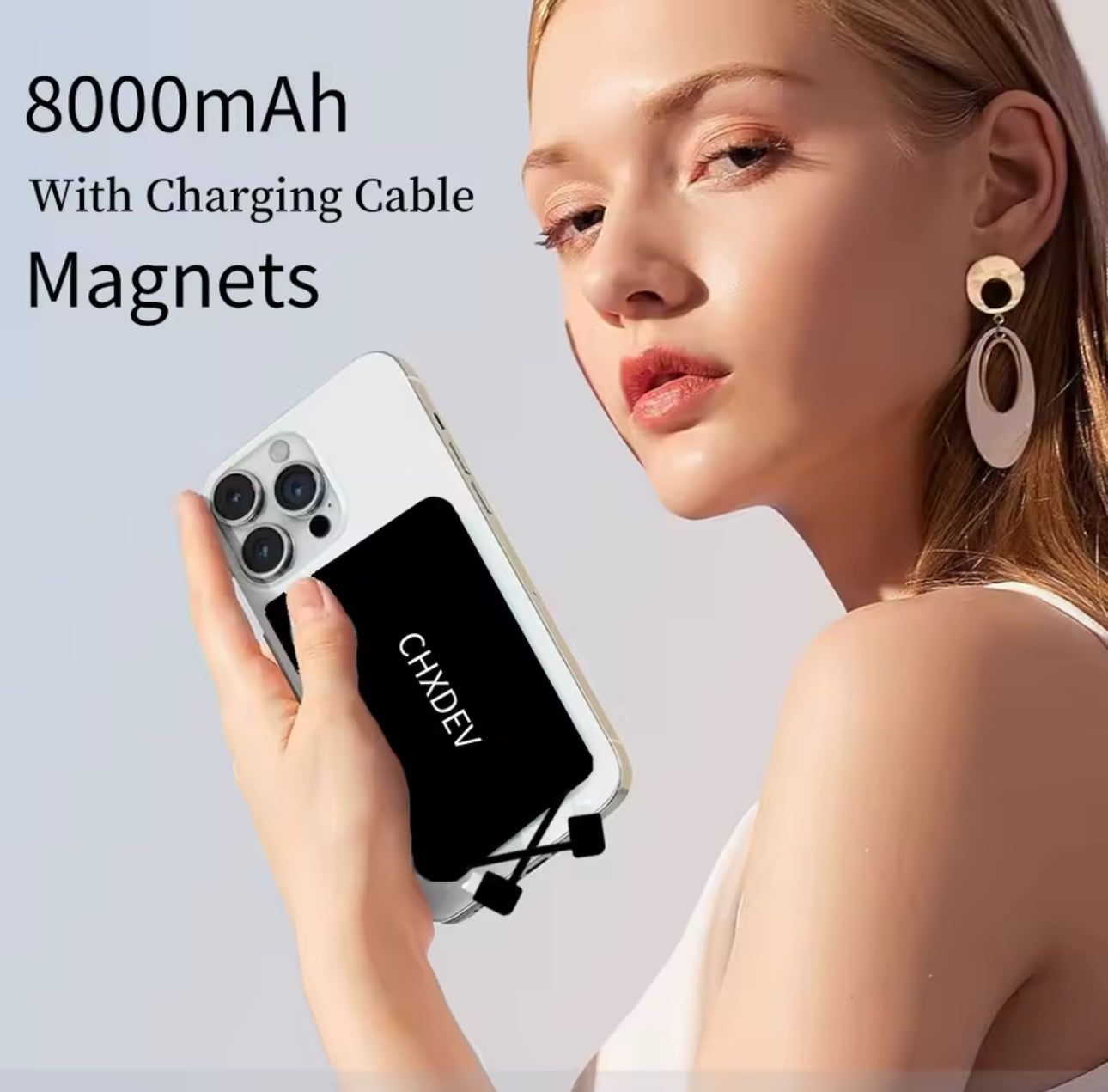 Ultra-slim magnetic charging card with 8000mAh power and built-in cables designed to keep your Iphone charged anywhere, without bulk or extra cords.